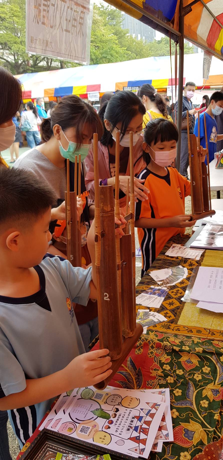 東南亞學系師生12月12日上午於獅湖國小校慶園遊會攞設攤位,推廣宣傳印尼文化與知識,帶領家長和小朋友演奏印尼國寶樂器「安格隆」。
