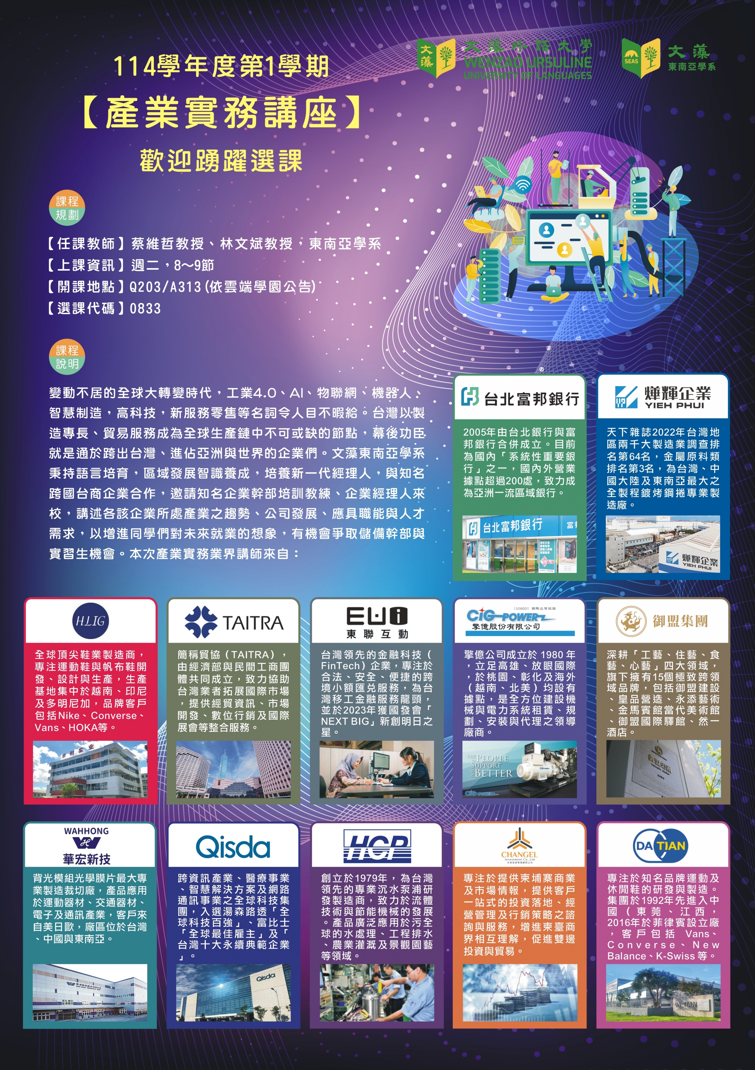 變動不居的全球大轉變時代,工業4.0、AI、物聯網、機器人、智慧制造,高科技,新服務零售等名詞令人目不暇給。台灣以製造專長、貿易服務成為全球生產鏈中不可或缺的節點,幕後功臣就是通於跨出台灣、進佔亞洲與世界的企業們。文藻東南亞學系秉持語言培育,區域發展智識養成,培養新一代經理人,與知名跨國台商企業合作,邀請知名企業幹部培訓教練、企業經理人來校,講述各該企業所處產業之趨勢、公司發展、應具職能與人才需求,以增進同學們對未來就業的想象,有機會爭取儲備幹部與實習生機會。本次產業實務業界講師來自: